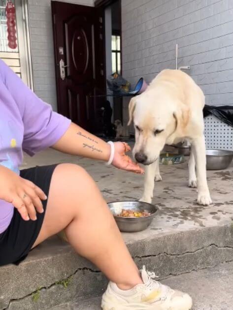 One day, a woman visited the village and saw the dog. She couldn’t get his eyes out of her mind. She came back the next day with food.