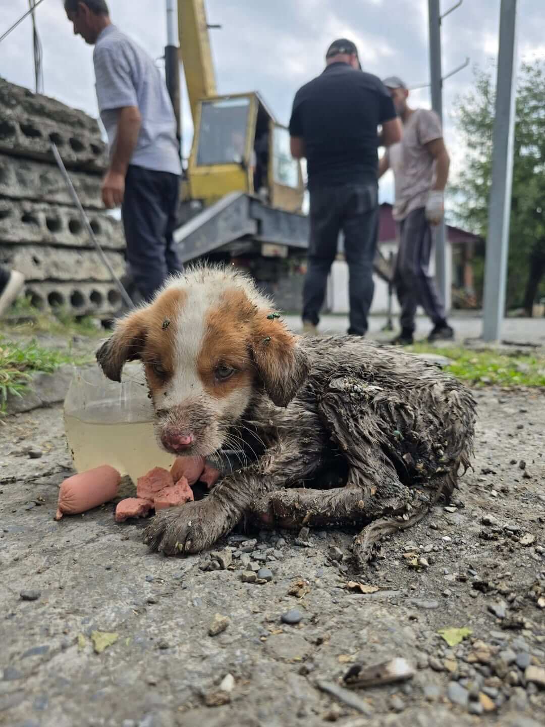 A puppy. Half-submerged in water. Covered in mud. Being eaten alive by flies.