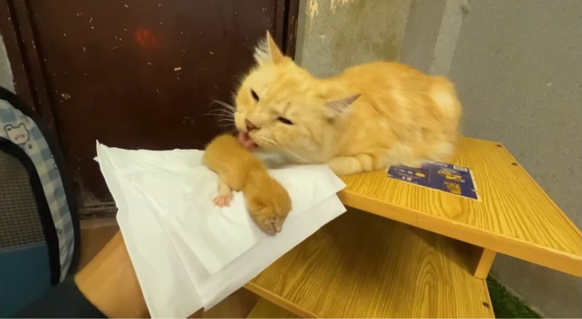 Abandoned at birth. Premature kitten gets adopted by the surrounding cats