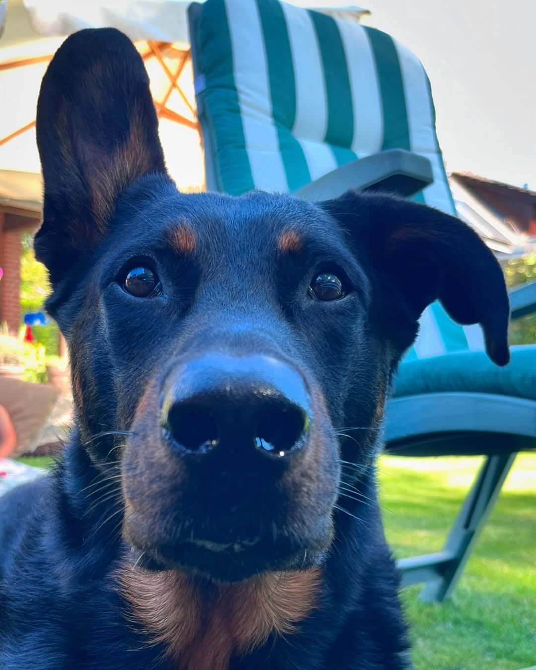 He is all business — upright posture, serious eyes, like he’s guarding the entire backyard with pride.