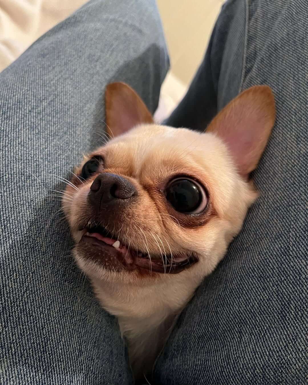 Tucked between her human’s legs like a tiny security system, this Chihuahua has seen things.